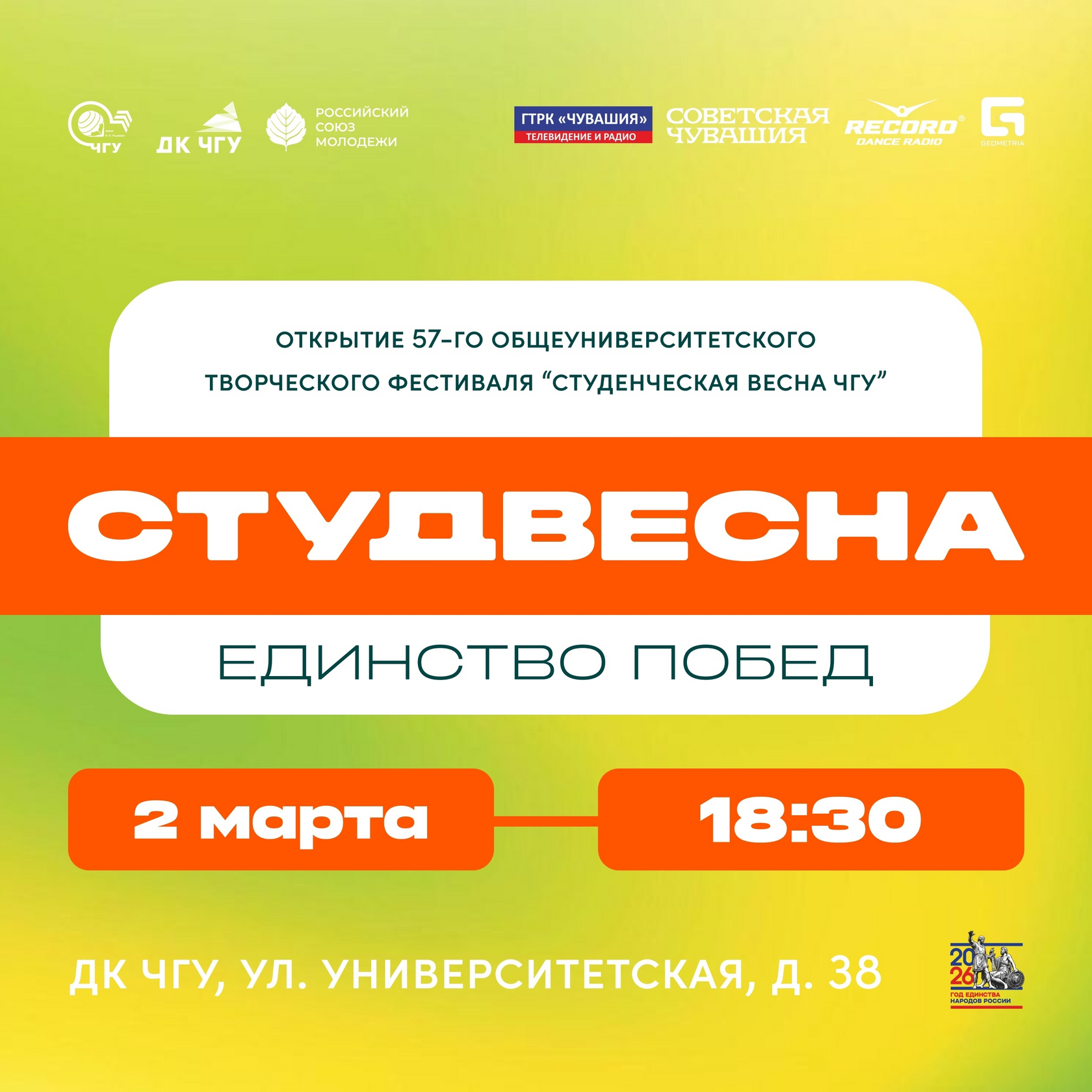 Ребята, не пропустите открытие 57-го творческого фестиваля «Студенческая весна ЧГУ»! Команда строительного факультета готовит яркие номера - им очень нужна ваша поддержка. Приходите поболеть, создадим атмосферу праздника вместе!